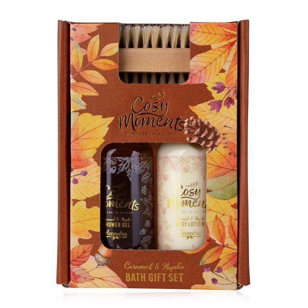 Tato dárková sada obsahuje sprchový gel (100ml),hydratující tělové mléko (100ml) a jemný kartáček na ruce. Neodolatelná vůně sladkého karamelu a javorového sirupu, zahalí vaše smysly do podzimní atmosféry plné tepla a útulnosti.