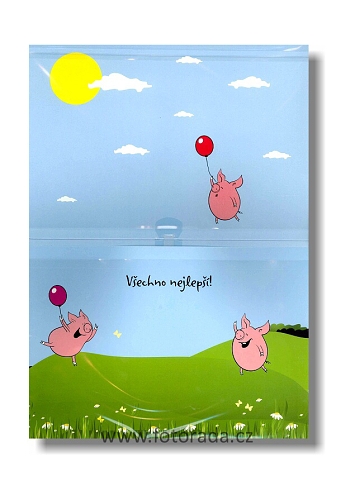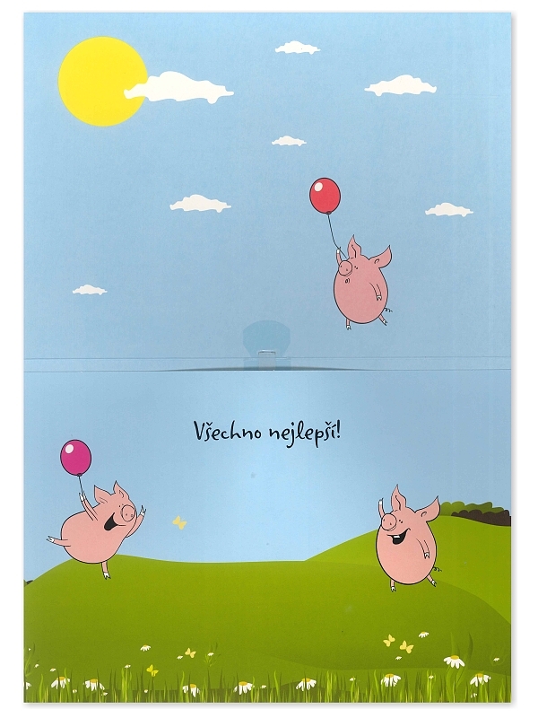 Originální kreslené hrací přáníčko dělané nezvykle na šířku. Vtipný motiv tří čuníku na obálce i v písničce.