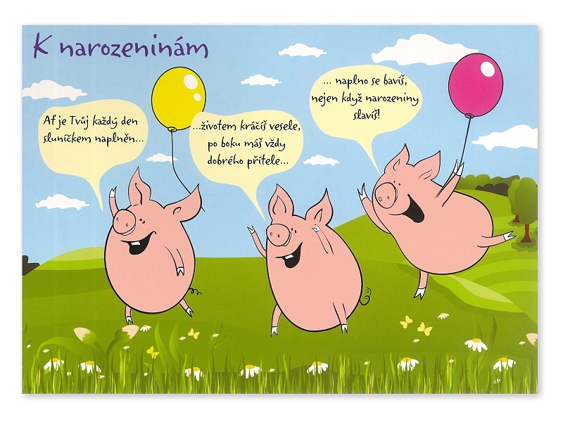 Originální kreslené hrací přáníčko dělané nezvykle na šířku. Vtipný motiv tří čuníku na obálce i v písničce.