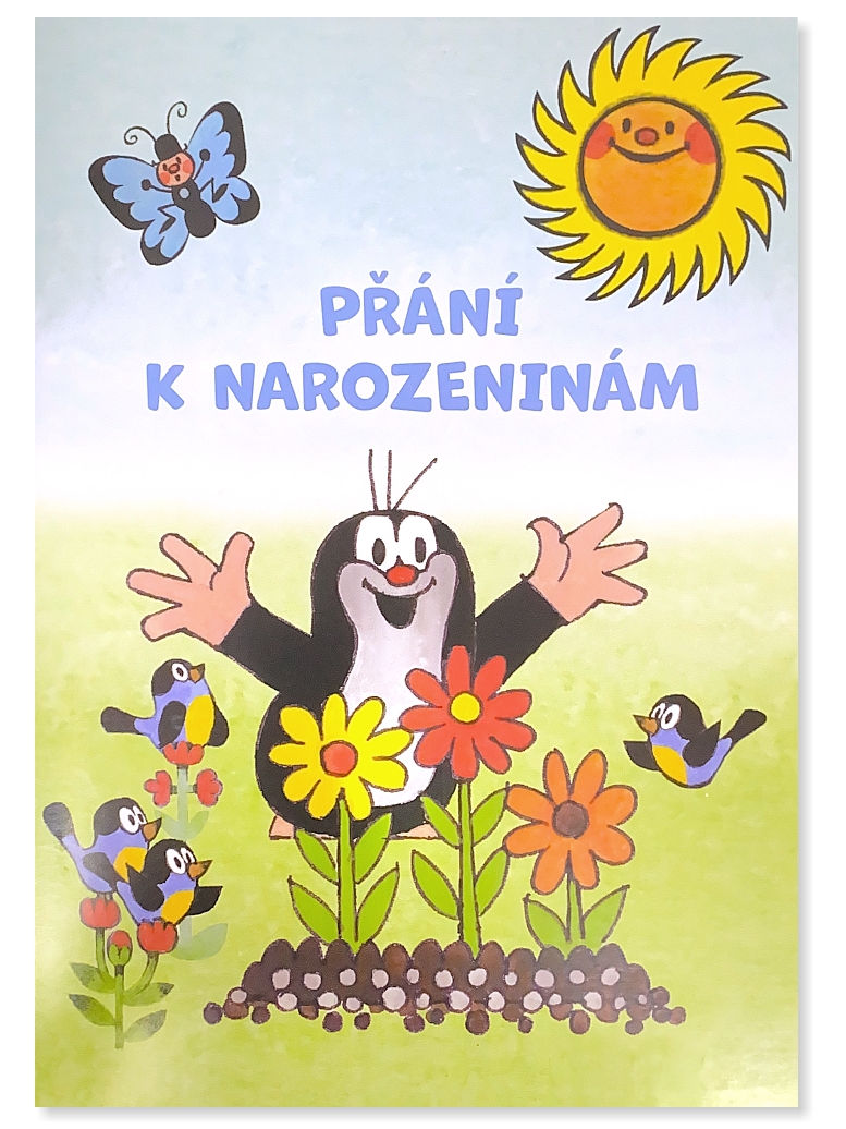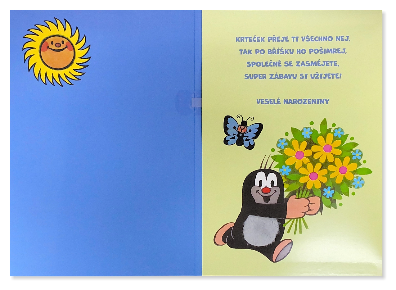 Když přání otevřete a polochtáte Krtečka na bříšku, tak se začne smát.