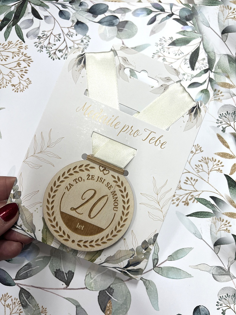Medaile je připevněna na krásném papírovém blistru zdobeném eukalyptem a zelenými listy s textem MEDAILE PRO TEBE ...