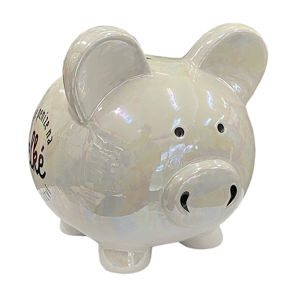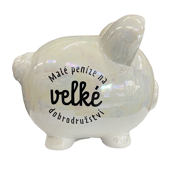 Velké perleťové prasátko jako pokladnička s nápisem: