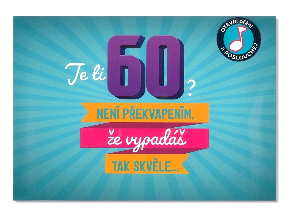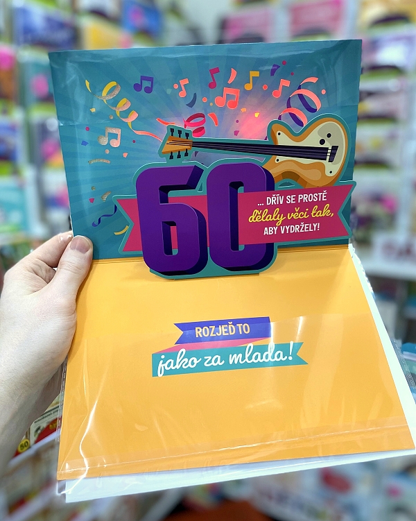 Při otevření přání uvidíte velkou plastickou šedesátku s kytarou a textem: