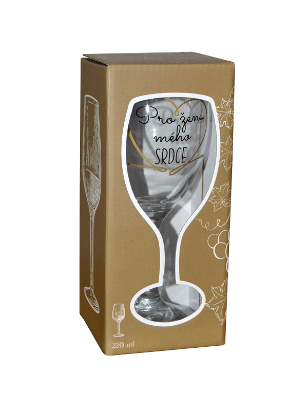 Sklenka je balena v dárkovém boxu s potiskem vína a výřezem.