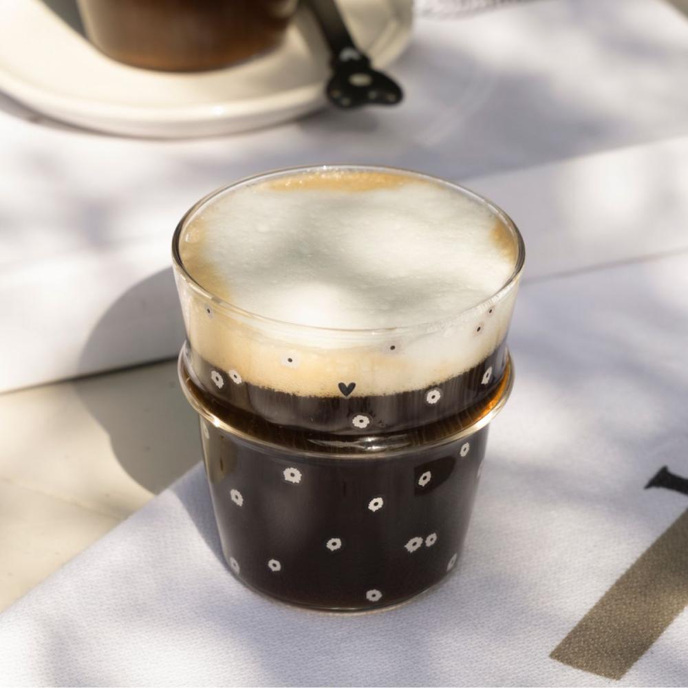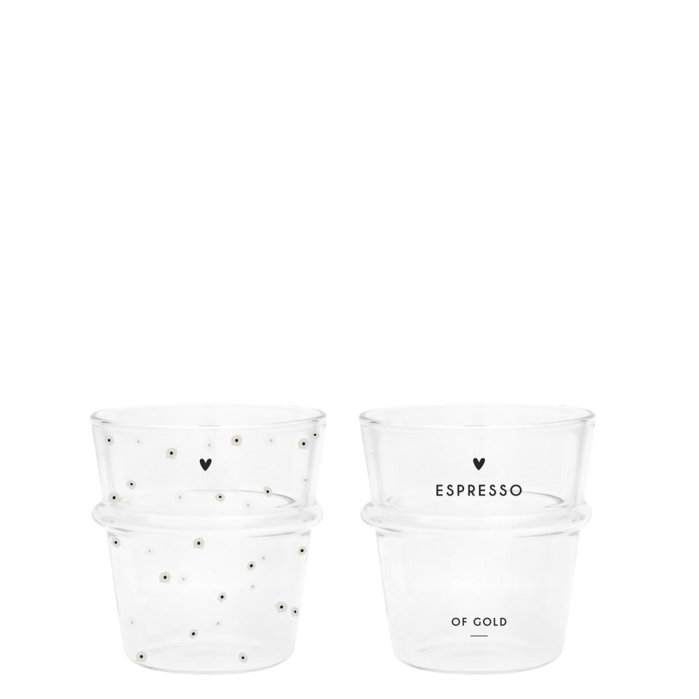 Oblíbené sklenky na espresso spuntíky a textem Espresso v černé barvě.