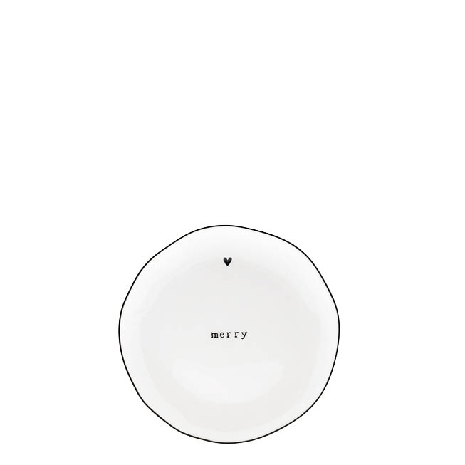 Dvojice nerozlučných talířků s černým nápisem Merry a karamelovými parohy s malým černým srdíčkem a černými ručně malovanými okraji.