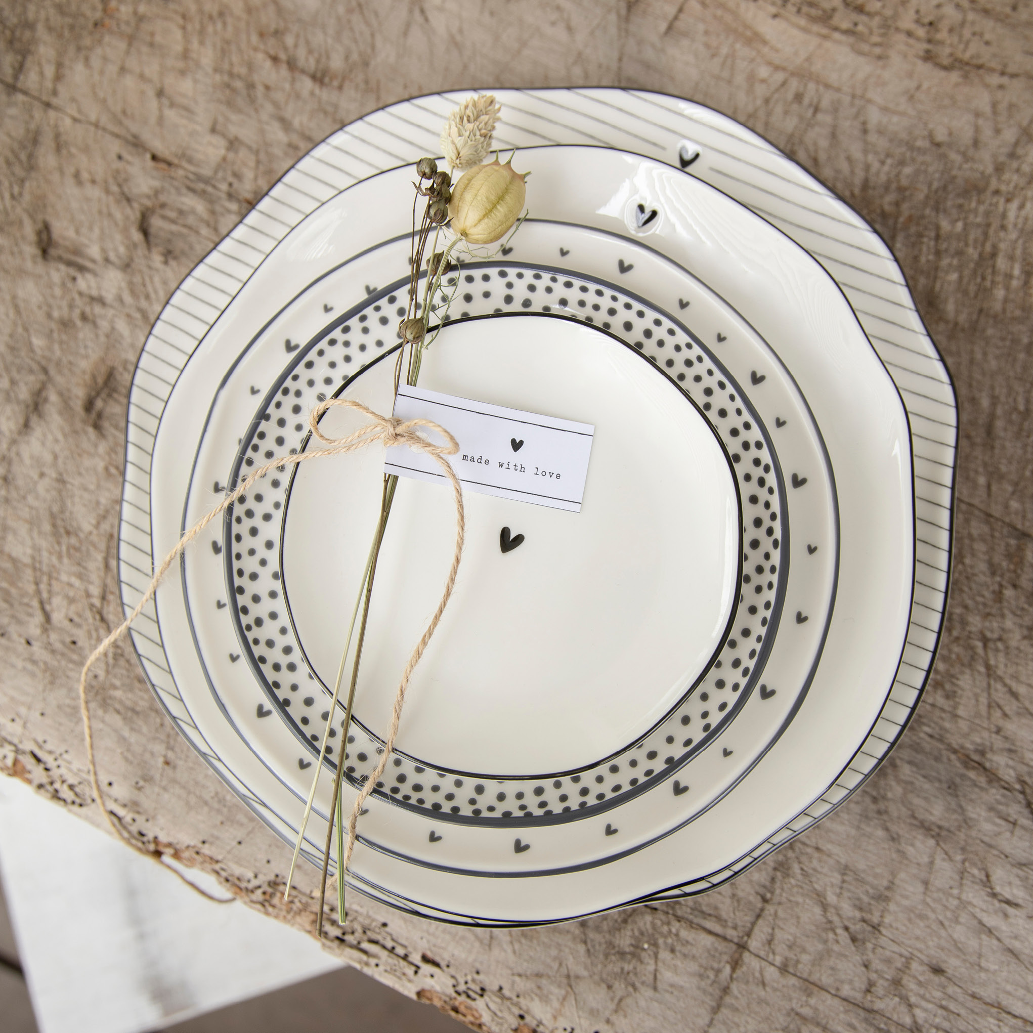 Nádherné velké talíře s černou linkou a malým roztomilým srdíčkem, kombinujte s proužky, a jinými úžasnými talířky a miskami a vytvořte si tu svou jídelní soupravu, která Vás potěší... tak přesně to je Bastion Collections.