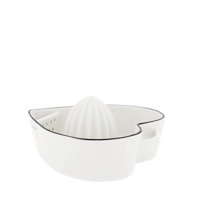 Citrusovač s miskou a nápisem Squeezer it. Je praktický, keramický s tradičním úchytem, který již naleznete na keramických dózách, máslence a nyní i na citrusovači. Je důležitou součástí kuchyní.