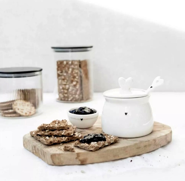 Dóza na džem v úžasném tvaru, který si zamilujete s malým černým srdíčkem a skleněnou lžičkou v kombinaci.