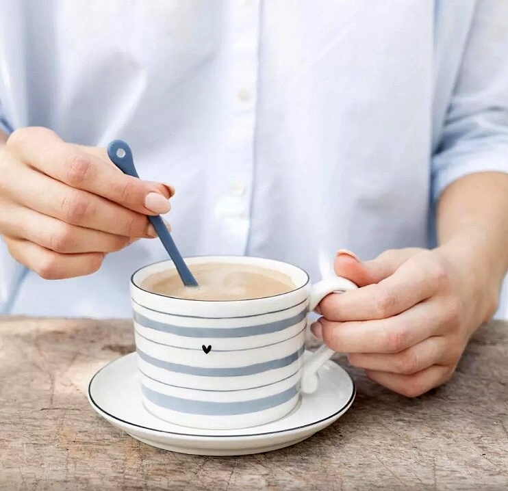 Úžasný, ručně malovaný hrneček se dvěma srdíčky z kolekce IRIS BLUE, objemem 300ml, vhodný do myčky a mikrovlnné trouby od holandské firmy Bastion Collections.
