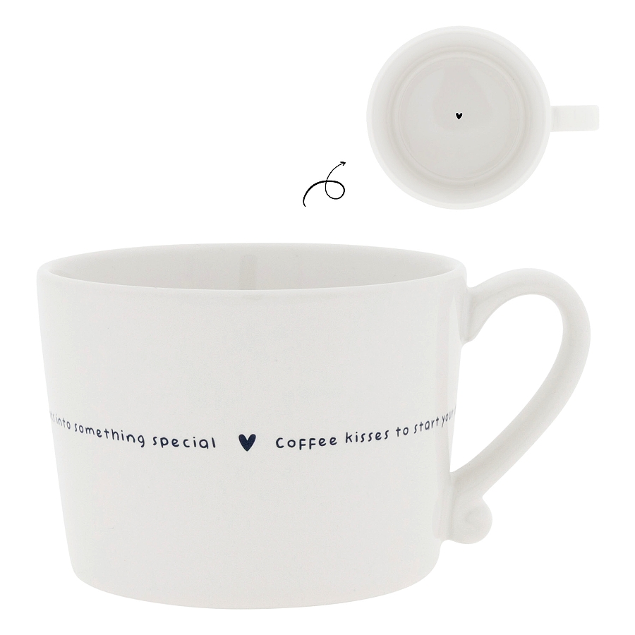 Úžasný, ručně malovaný hrneček s textem coffee kisses v jemném proužku s malým černým srdíčkem, s objemem 0,3 l, vhodný do myčky a mikrovlnné trouby od holandské firmy Bastion Collections.