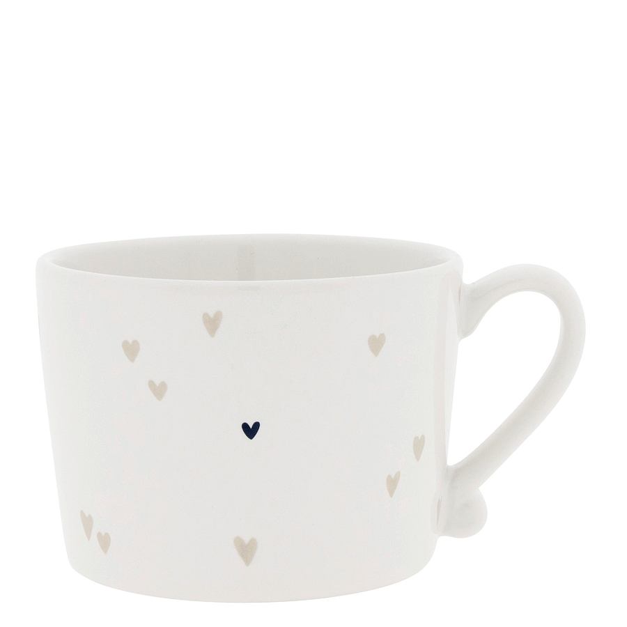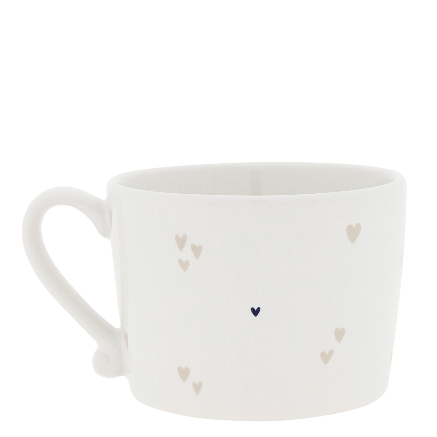 Úžasný, ručně malovaný hrneček s malými béžovými srdíčky a jedním černým srdíčkem, s objemem 0,3 l, vhodný do myčky a mikrovlnné trouby od holandské firmy Bastion Collections.