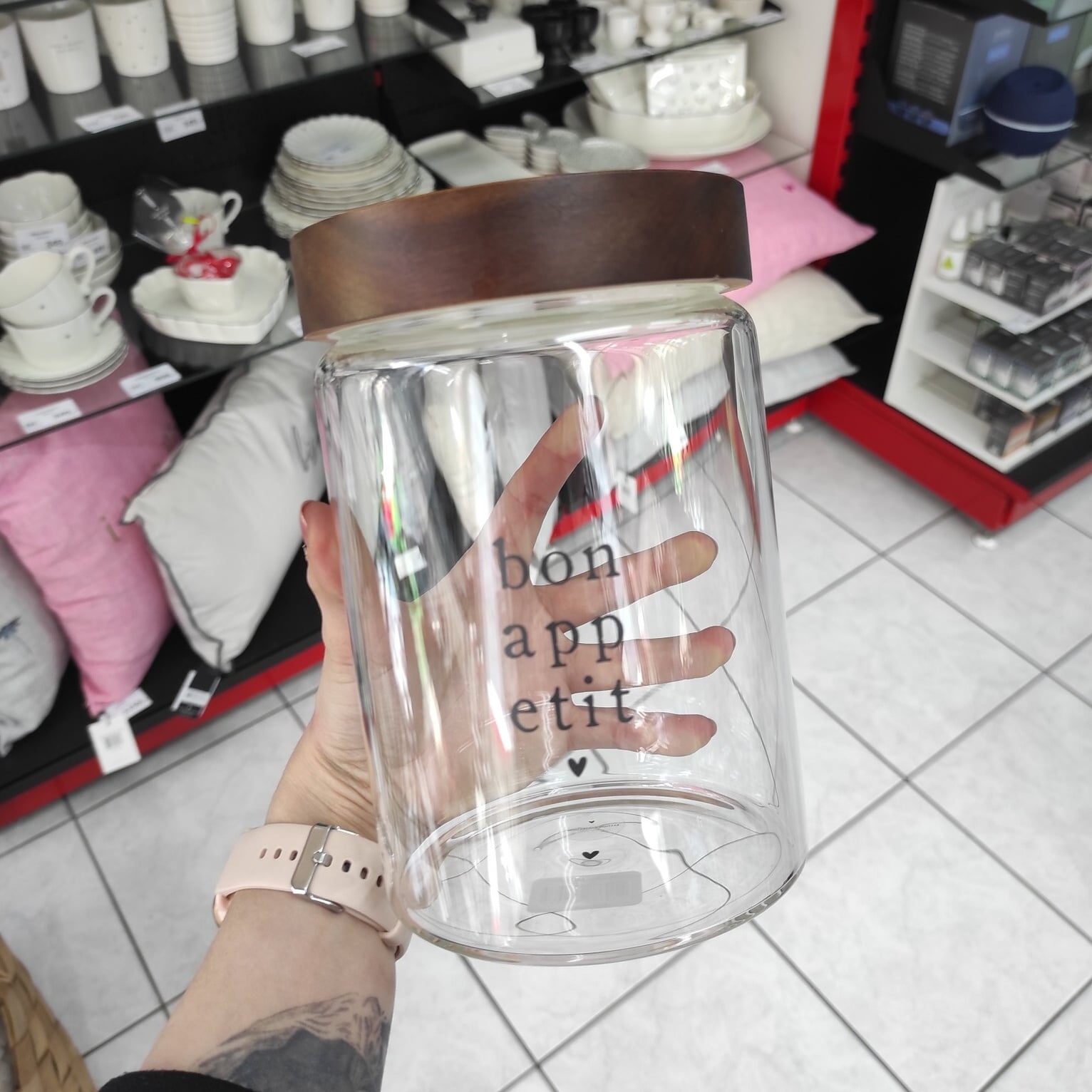 Nádherná skleněná dóza s masivním dřevěným víčkem a nápisem Bon appetit. Využijte tuto skleněnou dózu na skladováním potravin, sušenek od holandské firmy Bastion Collections.