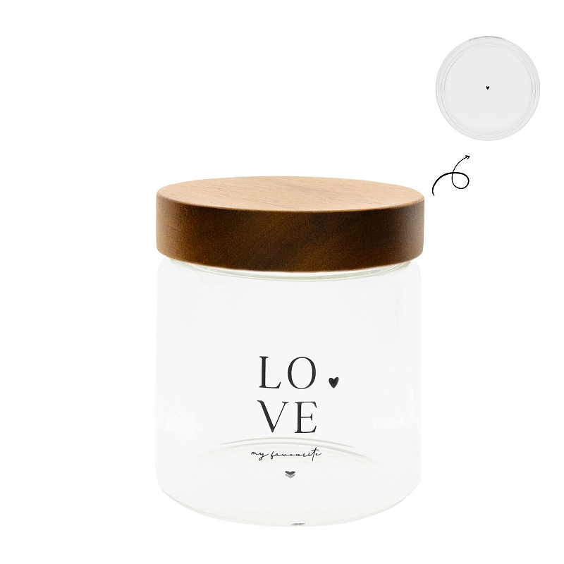 Nádherná skleněná dóza s masivním dřevěným víčkem a nápisem Love. Využijte tuto skleněnou dózu na skladováním potravin, sušenek, ale můžete ji využít třeba i na knoflíky nebo na prací prášek v prádelně. Fantazii se zde meze nekladou.