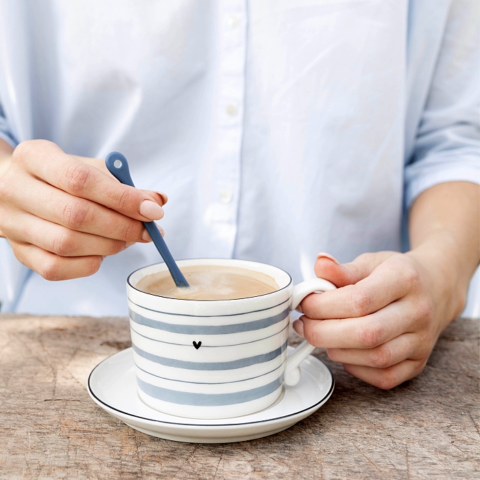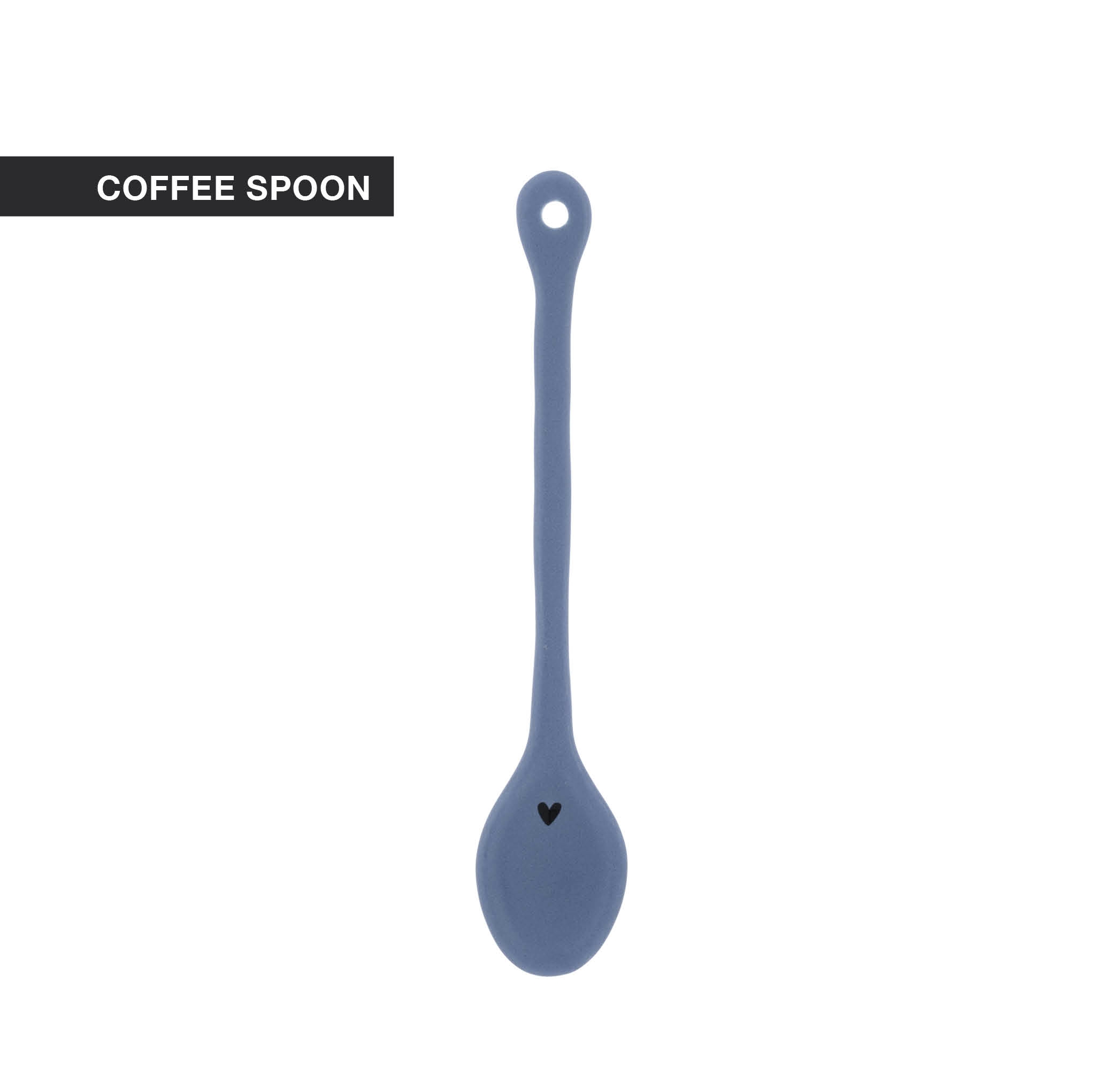 Plochý tvar modré keramické lžičky s černým srdíčkem.
