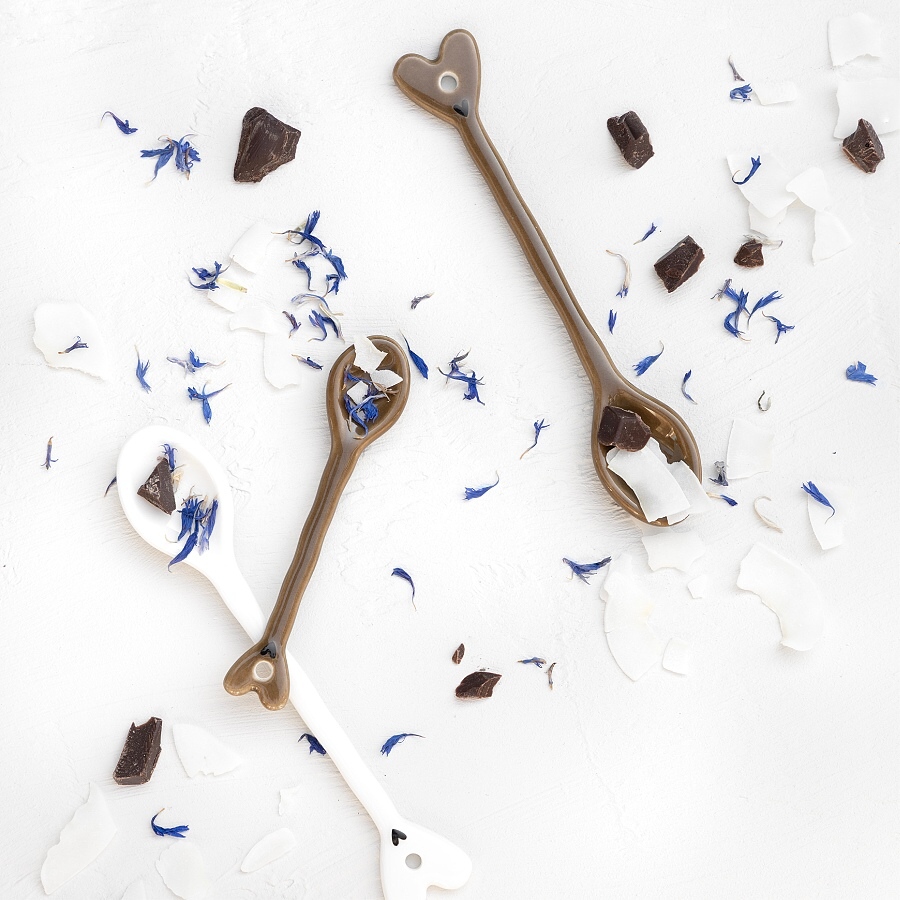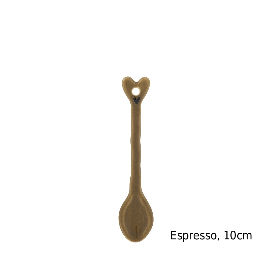 Keramická lžička plochého tvaru v hnědém provedení vhodná pro maličké hrnečky na espresso nebo na vajíčka. Skvělá tedy ke stojánku na vajíčko a malému oválnému podšálku. S již tradičním černým srdíčkem.
