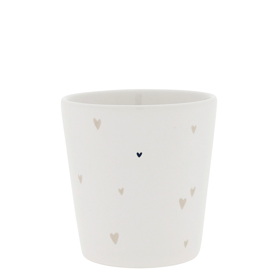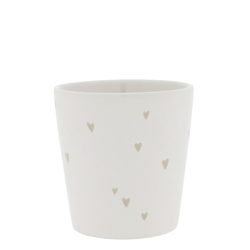 Malebný keramický kelímek s malými béžovými srdíčky a jedním černým srdíčkem na přední straně. Také milujete kelímky na kávu? Já velmi, můžete s ním pít kávu po celém obvodu, snadno je udržíte v ruce, kávu udrží kermaika dlouho příjemně teplou a mají více využití.