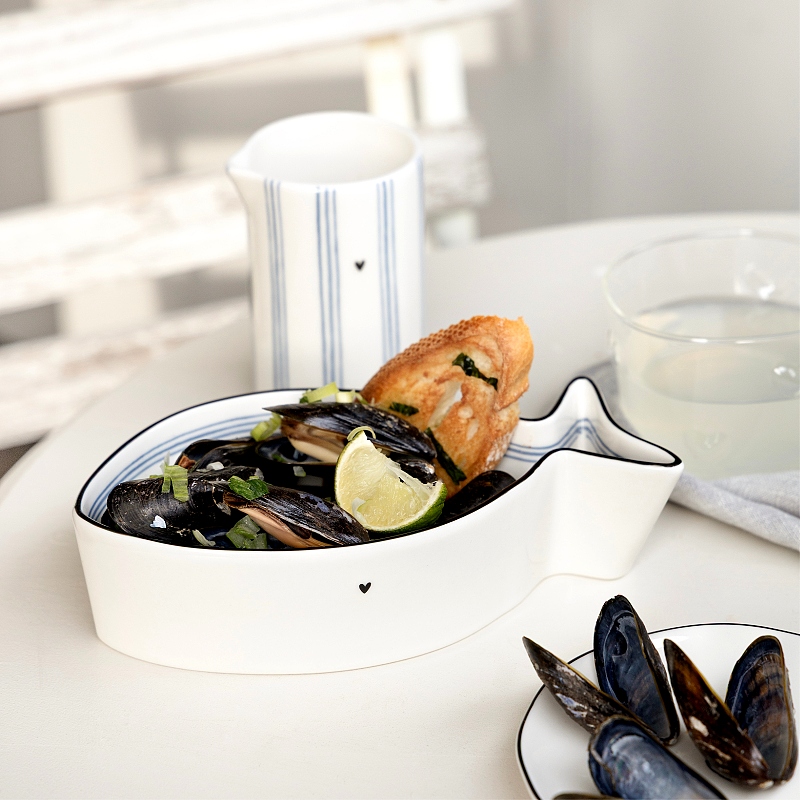 Keramická konvička na mléko s jemnými modrými proužky a malým černým srdíčkem od holandské firmy Bastion Collections.