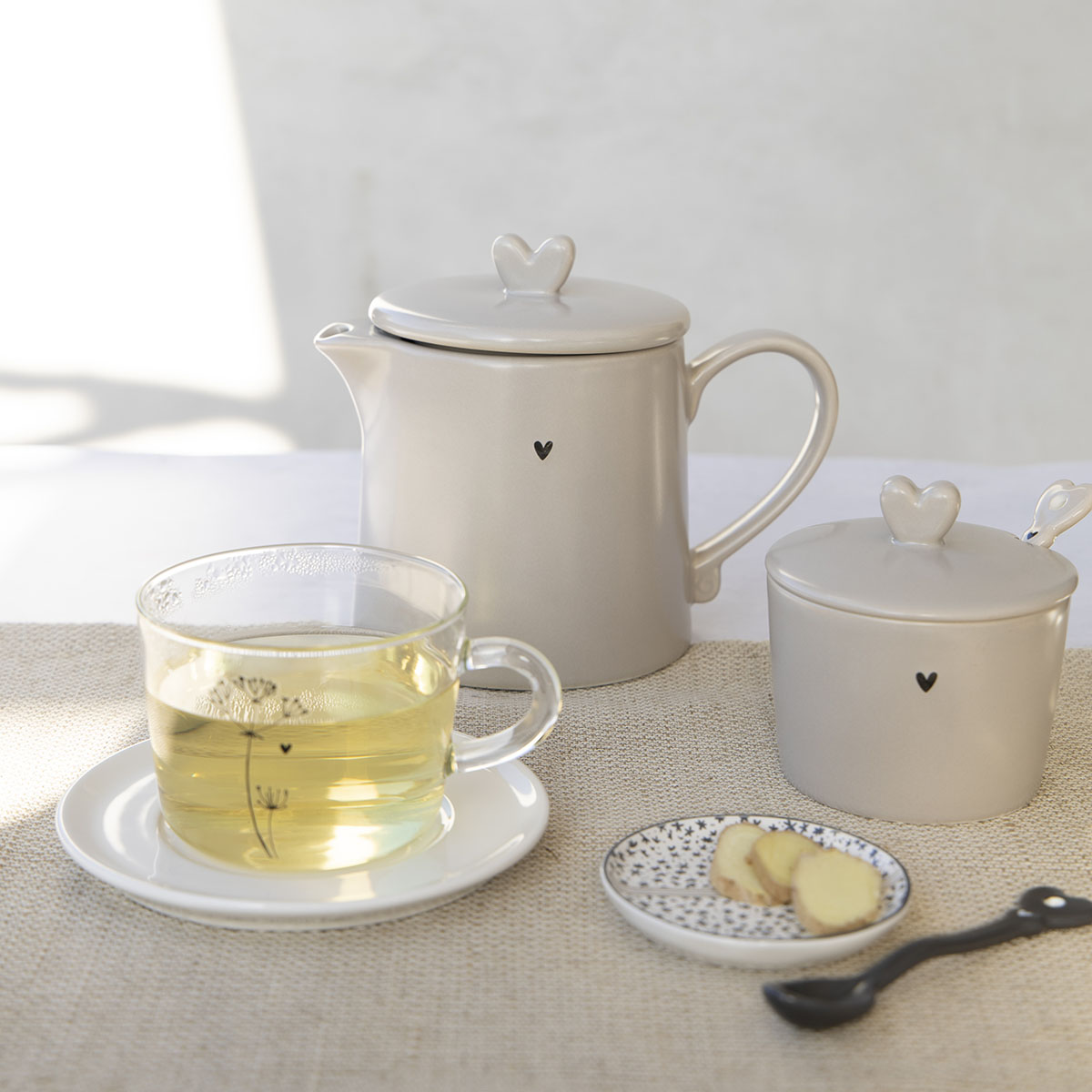 Ručně malovaná čajová konvice v béžové barvě se srdcem v černé barvě od holandské firmy Bastion Collections.