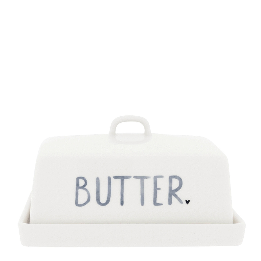 Keramická máslenka s tradičním tvarem ouška a modrým nápisem "BUTTER" / máslo a malým černým srdíčkem od holandské firmy Bastion Collections. Na zadní straně