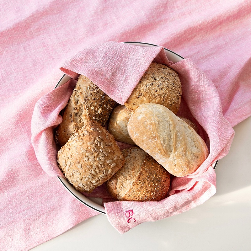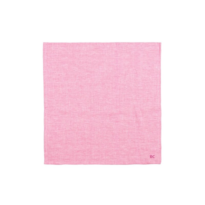 Lněný čtvercový ubrousek v růžové barvě a výšivkou BC, rozměr 50x50cm od holandské firmy Bastion Collections.