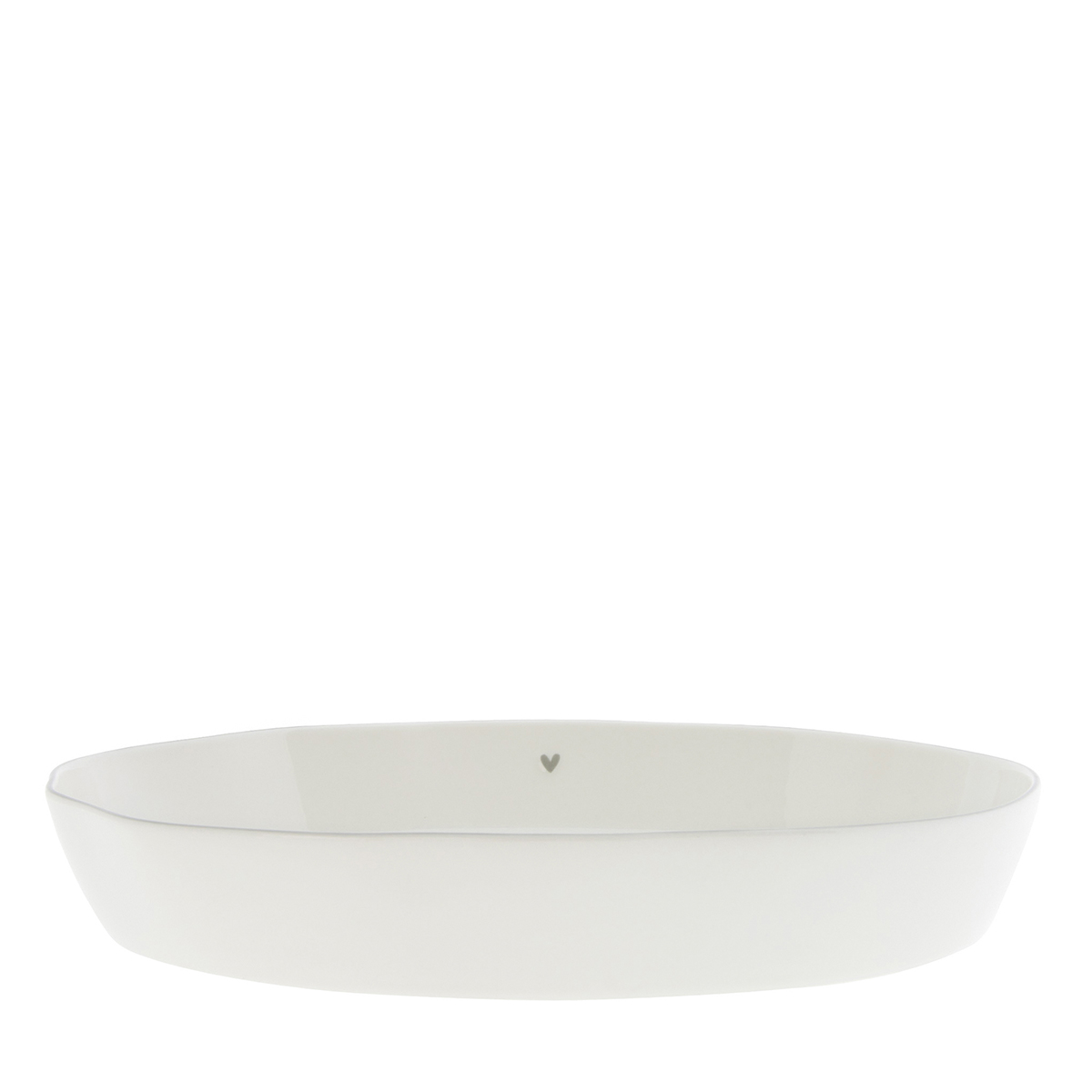 Ručně malovaná zapékací miska v bílé barvě s šedým okrajem a srdcem od holandské firmy Bastion Collections.