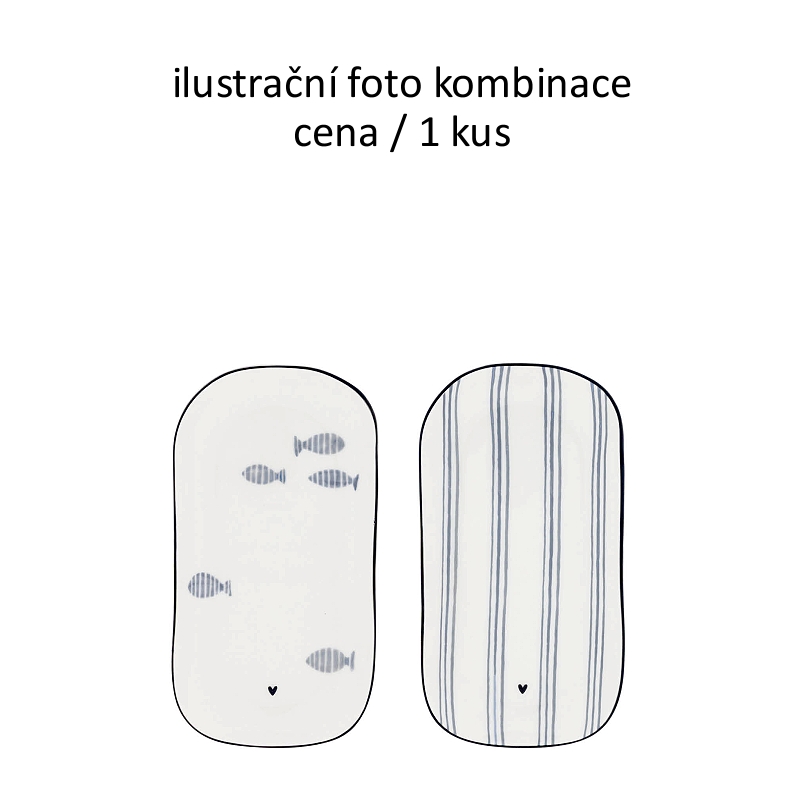 Oválný servírovací talířek malý na espresso s modrým potiskem ryb od holandské firmy Bastion Collections. Využít můžete i na malé zákusky, kanapky, dezerty, drobné ovoce i zeleninu. V koupelně lze použít na odkládaní prstýnků, řetízků nebo malých mýdel či mýdlových květů.