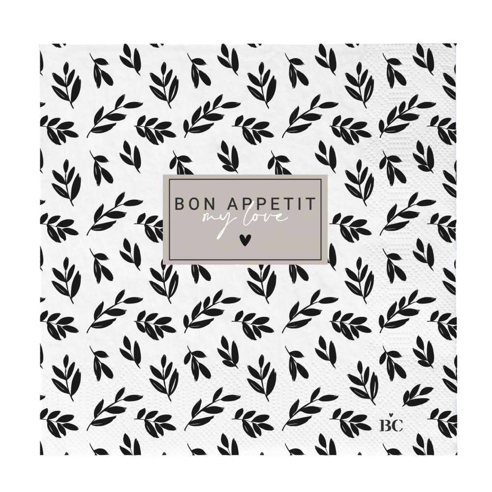 Velké papírové ubrousky s listy a nápisem "Bon appetit my love" v béžové/černé barvě.