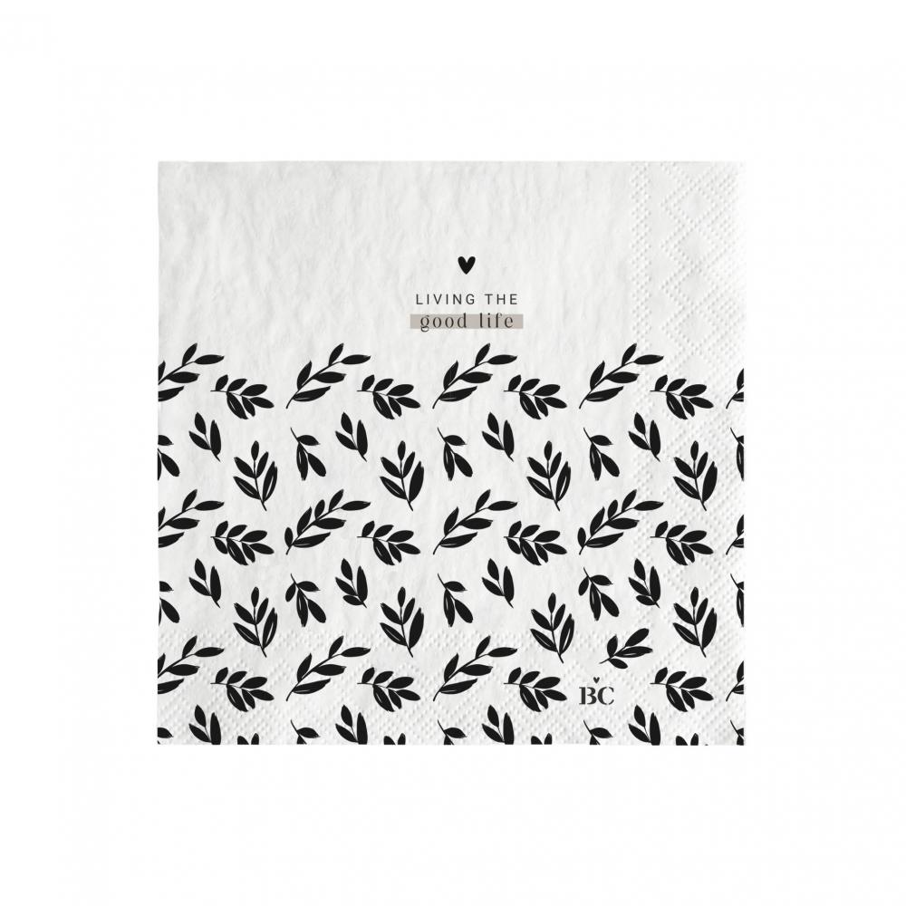 Malé papírové ubrousky s listy a nápisem "Living the good life" v černé barvě.