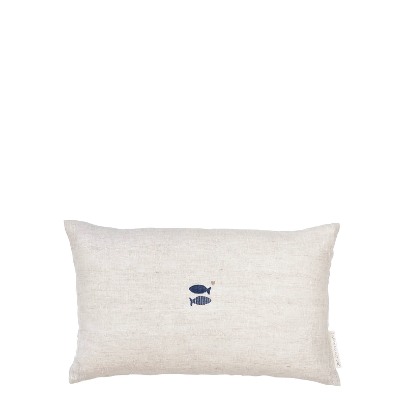 Menší lněný polštářek včetně výplně v přírodním provedení s vyšívanými modrými rybkami od holandské firmy Bastion Collections.