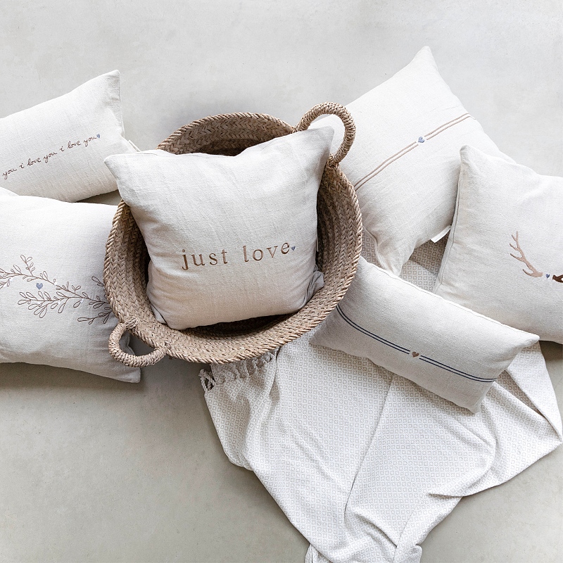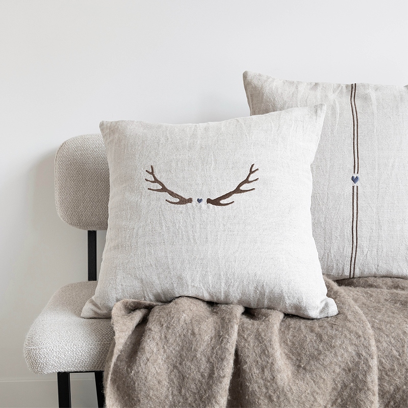 Nádherný vyšívaný polštář hnědými parohy a šedým srdíčkem velikosti 50x50cm od holandské firmy Bastion Collections.