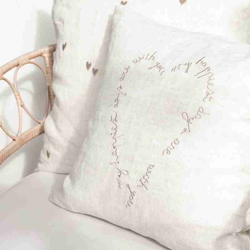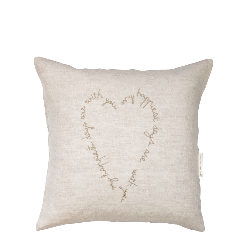 Polštář i s výplní s vyšívaným textem ve tvaru srdce v přírodním provedení od holandské firmy Bastion Collections.