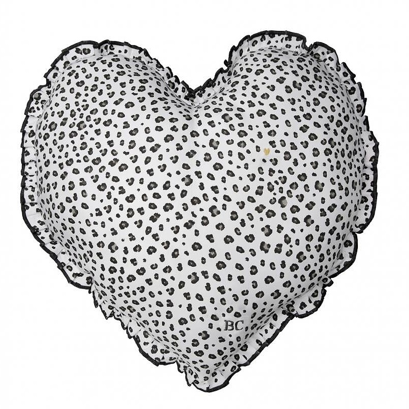 Velký polštář ve tvaru srdce s volánky, v béžové barvě s potiskem vzoru Leoparda v černé barvě od holandksé firmy Bastion Collections.