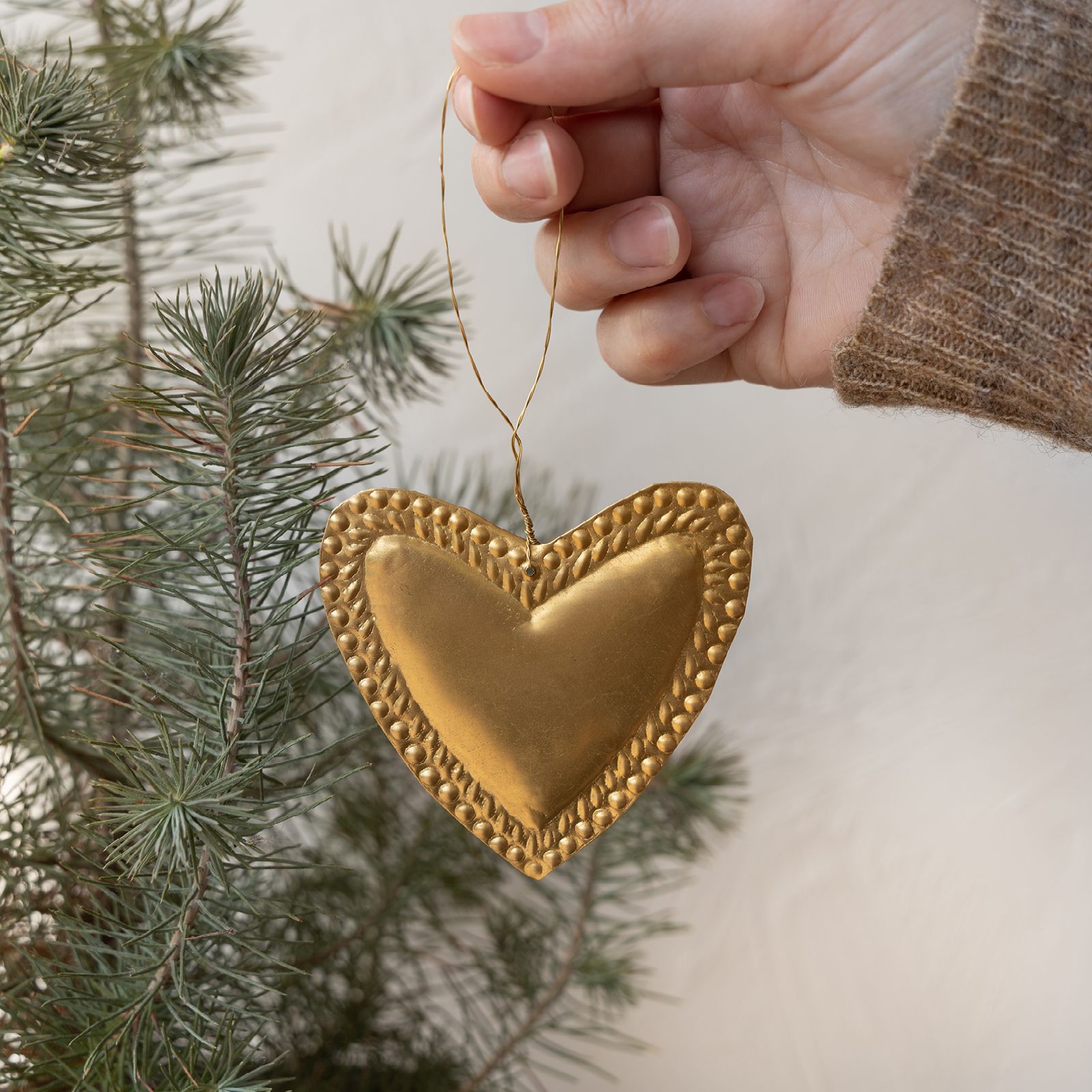 Zlatý přívěsek srdce z mosazi je krásnou ozdobou vánočního stromečku