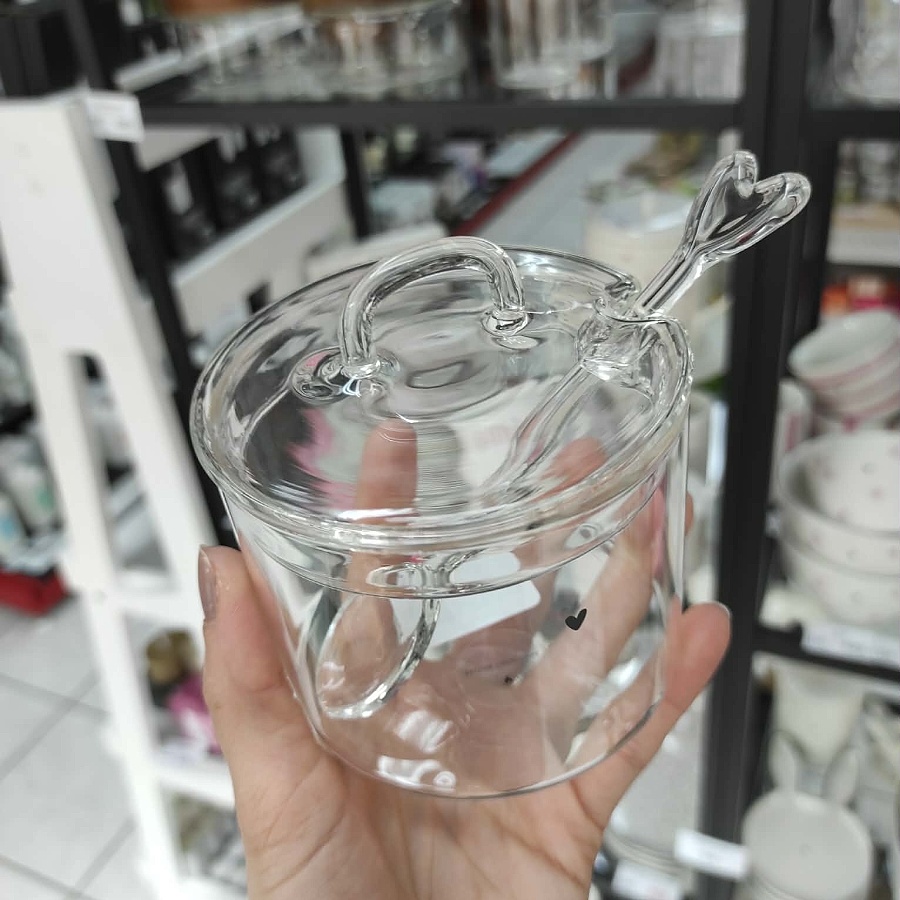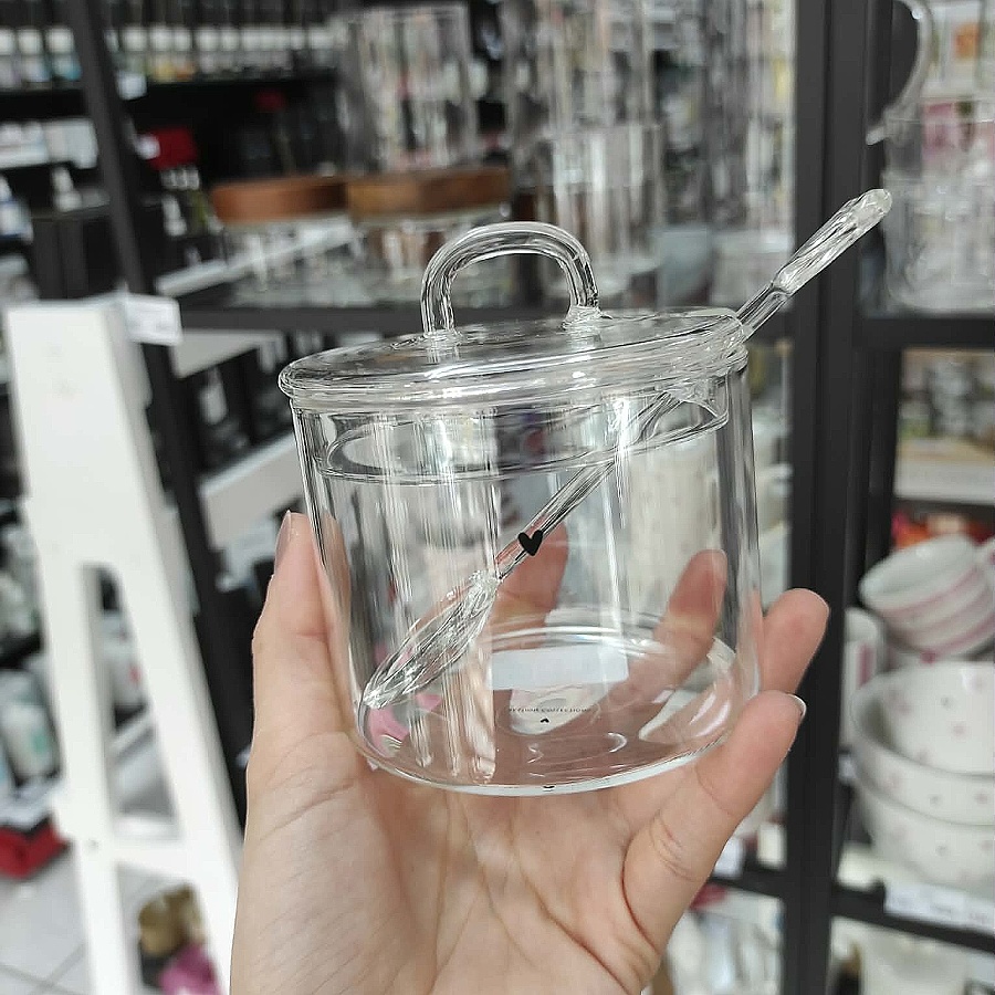 Skleněná cukřenka se skleněnou lžičkou a hned máte přehled, kolik cukru ještě zbývá. Tato lehká průhledná cukřenka s malým černým srdíčkem se bude skvěle kombinovat s ostatním doplňky této kolekce.