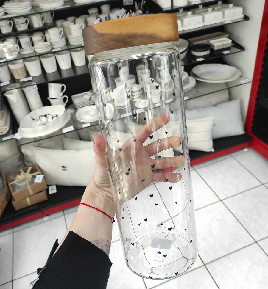 Vysoká skleněná nádoba na těstoviny potištěná černými srdíčky a s dřevěným víčkem.