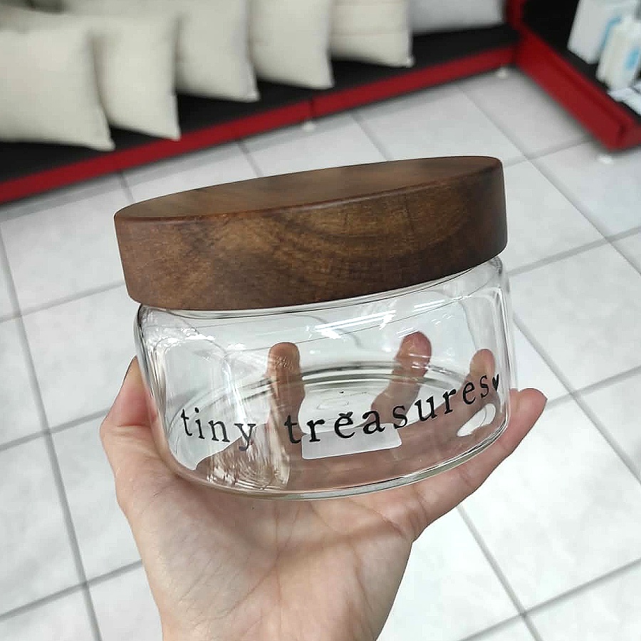 Menší skleněná dóza s dřevěným víčkem a textem "tiny trasures".