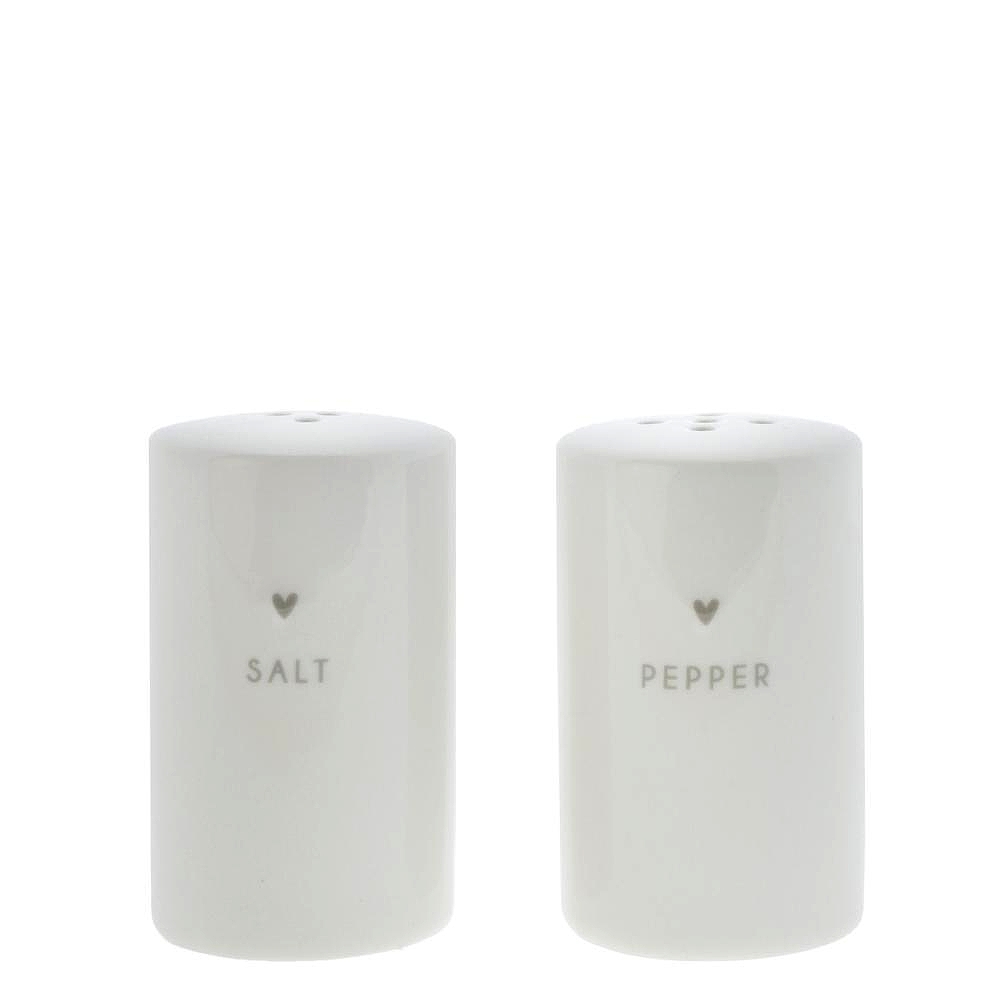 ručně malovaná slánka a pepřenka v bílé barvě se srdíčkem a nápisem "sůl + pepř" v šedé barvě.