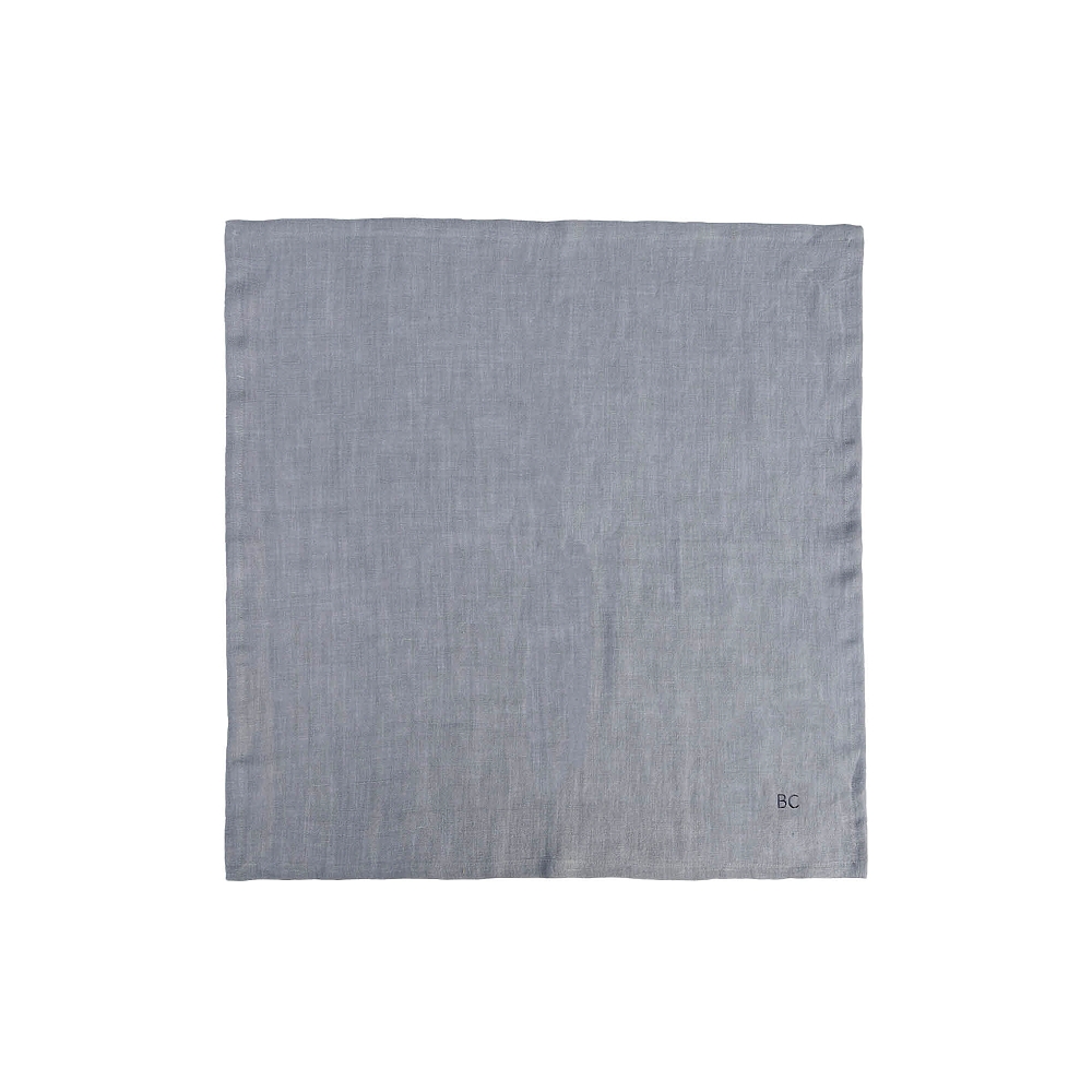 Malý středový ubrus v modro-šedé barvě 100% bavlny je zdoben jednoduchou výšivkou loga firmy Bastion Collections - BC.