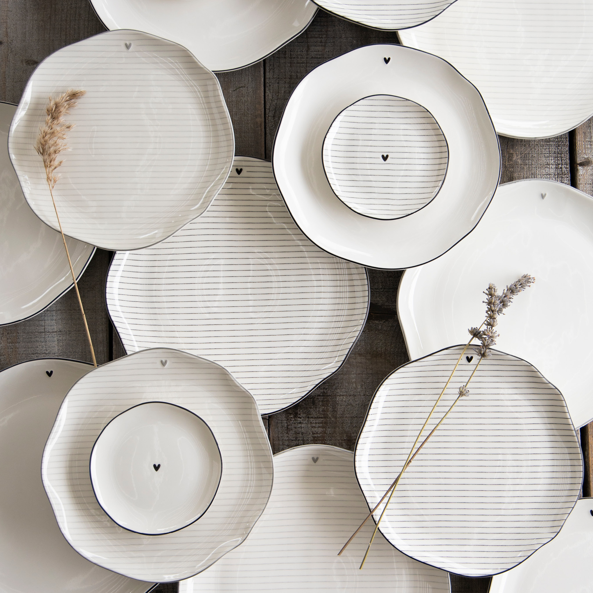 Nádherný velký talíř s černou linkou a malým roztomilým srdíčkem, kombinujte s proužky, a jinými úžasnými talířky a miskami a vytvořte si tu svou jídelní soupravu, která Vás potěší... tak přesně to je Bastion Collections.
