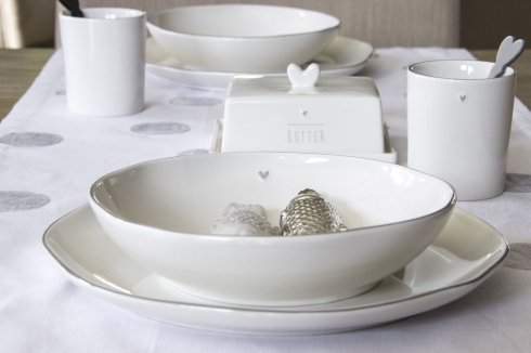 Nádherný velký talíř s šedou linkou a malým roztomilým srdíčkem, kombinujte s proužky, a jinými úžasnými talířky a miskami a vytvořte si tu svou jídelní soupravu, která Vás potěší... tak přesně to je Bastion Collections.