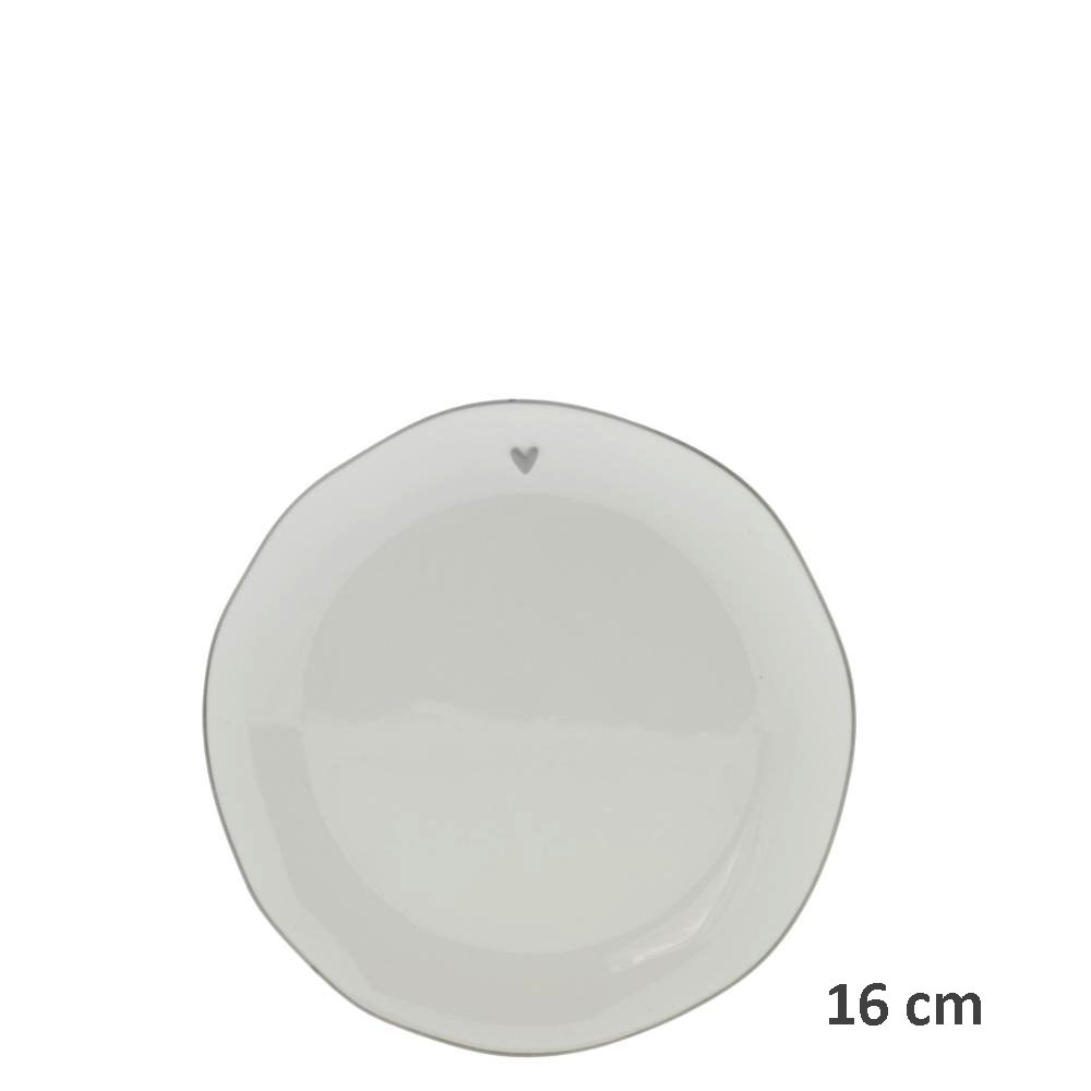 Oblíbený talířek s šedým rozmanitým okrajem s ručně malovanou linkou a srdíčkem v šedé barvě od holandské firmy Bastion Collections.