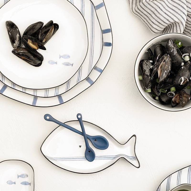 Keramický, ručně malovaný talířek s jemným modrým rybím potiskem od holandské firmy Bastion Collections.