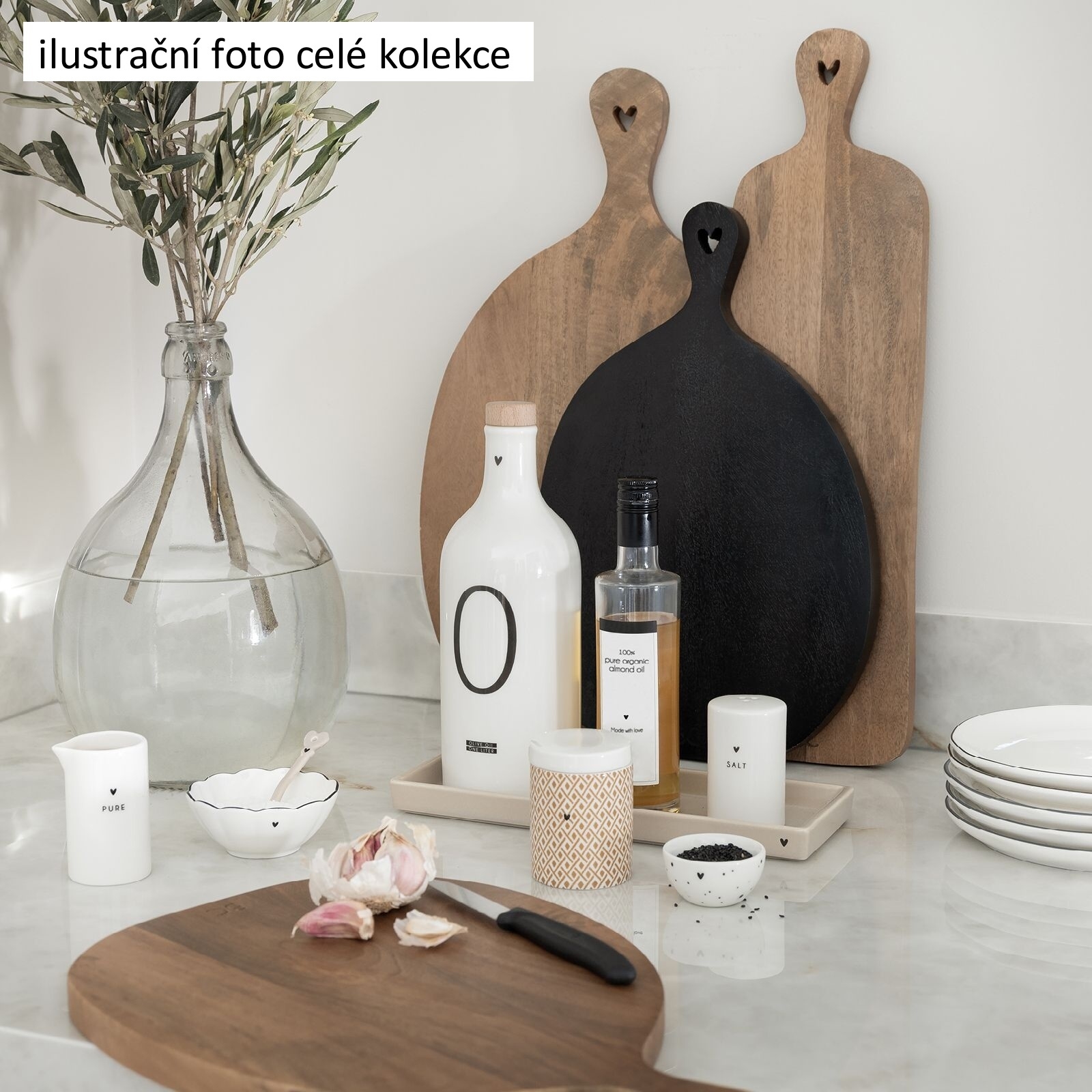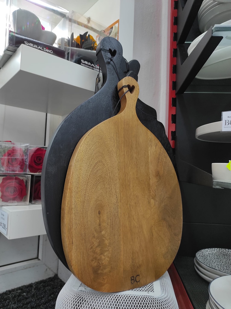 Velké dřevěné servírovací prkénko ve tvaru oválu s vyřezávaným srdíčkem v horní části madla a logem BC v dolní části prkénka od holandské firmy Bastion Collections.