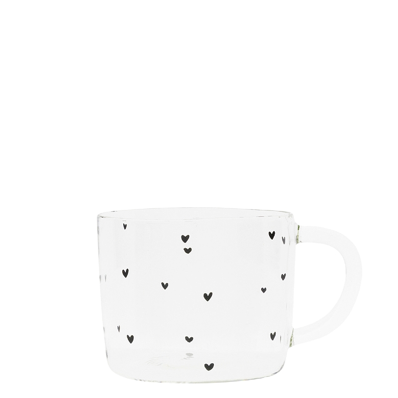 Skleněný hrneček se spoustou malých černých srdíček na báječný čaj, kávu nebo svařák.