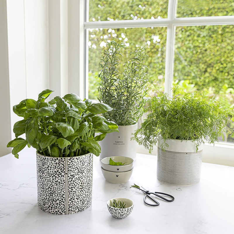 Ručně malovaný květináč s květinovým vzorem a srdcem v černé / béžové barvě od holandské firmy Bastion Collections. Lze použít i jako držák kuchyňského náčiní.
