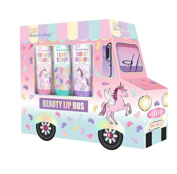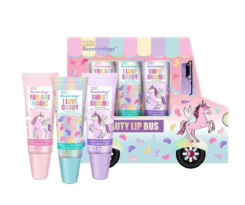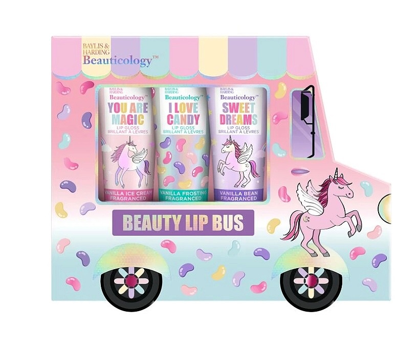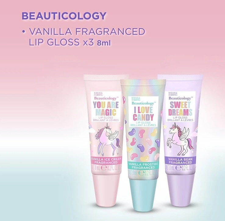 Pro kouzelný glam, ať už na cestě do školy nebo na setkání s přáteli, obsahuje tato dárková sada 3 lesky na rty s vanilkovou příchutí. Zábava, jednorožci, vůně cukrovinek a pocit štěstí - to je sada lesků na rty, o které sní každá dívka! Obalí rty hedvábně jemnou texturou, která zanechá hebké, vláčné a vyživené rty s třpytivým efektem.