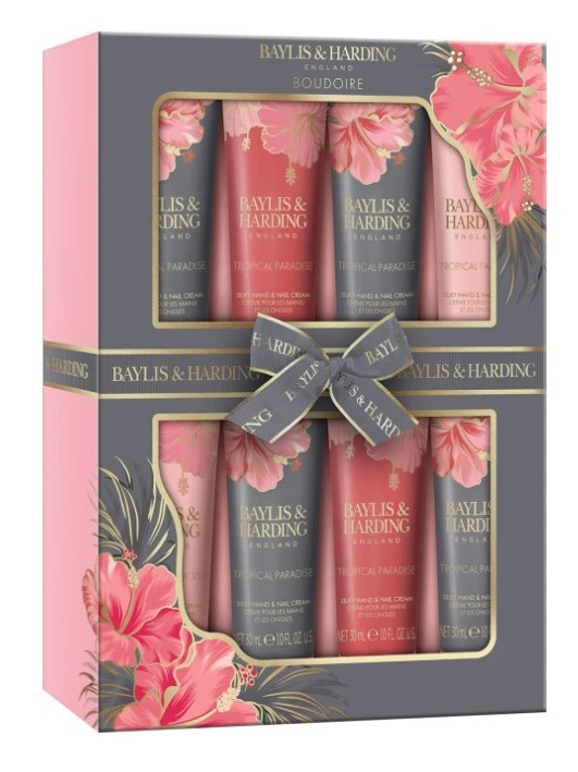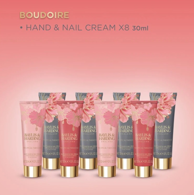 Kolekce Boudoire nabízí limitovanou edici produktů s novou exotickou vůní banánu, broskve a pomerančových květů. Je inspirovaná přehlídkovými moly, interiérovými a lifestylovými trendy, ve kterých se stále více objevují nádherně zbarvené květy. Právě květy tropického ibišku v růžových tónech se promítly do designu kolekce Boudoire, které společně se zlatými detaily a šedým pozadím dotváří luxusní, moderní a něžný vzhled pečující kosmetiky.