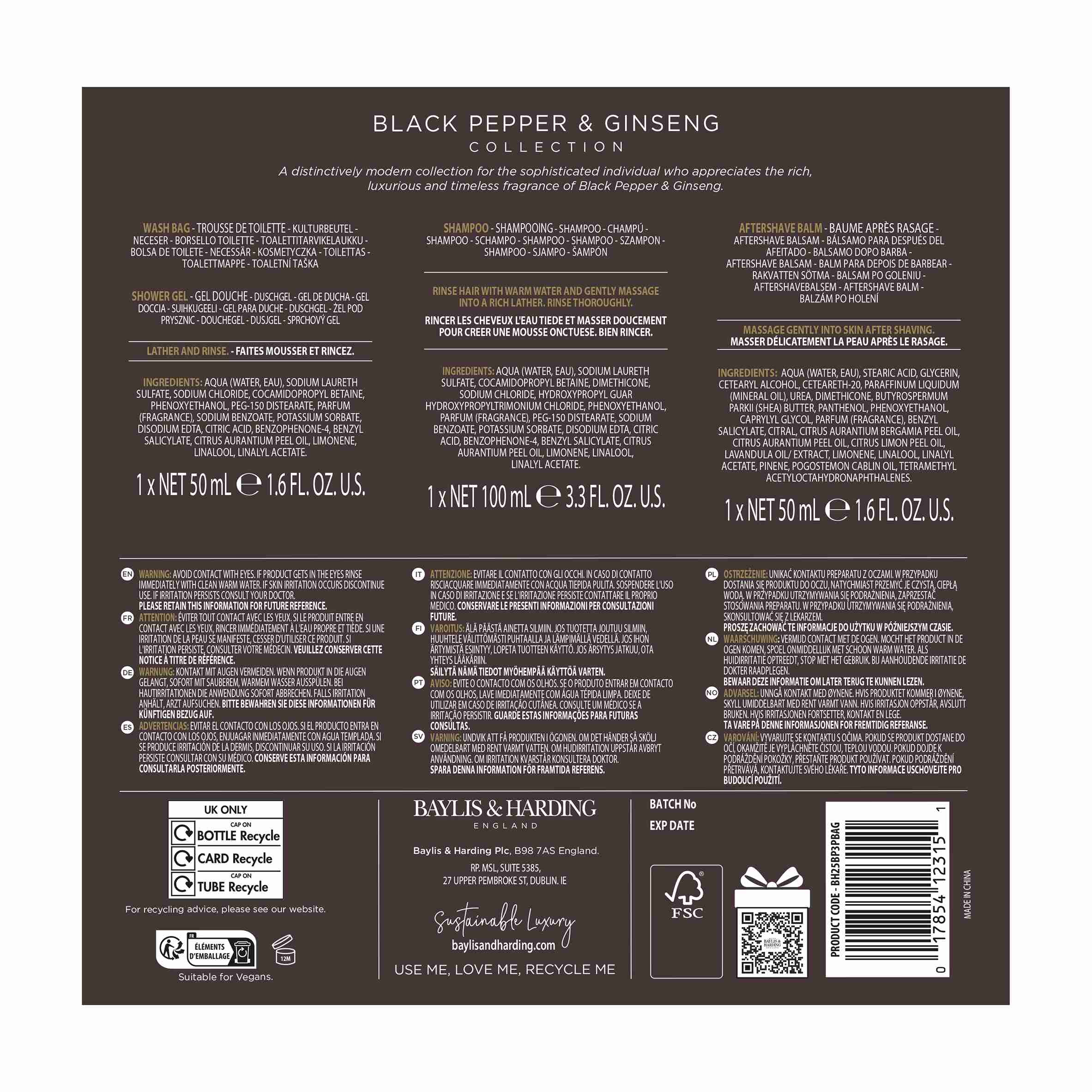 Nadčasová a sofistikovaná pánská kolekce Black Pepper & Ginseng propůjčila svému designu moderní, dynamický vzhled s ikonickou šachovnicovou grafikou a elegantními bronzovo-zlatými detaily. Společně s ovocno-kořeněnými tóny černého pepře, ženšenu, cedrového a santalového dřeva vytváří elegantní kolekci produktů péče o tělo pro všechny gentlemany.