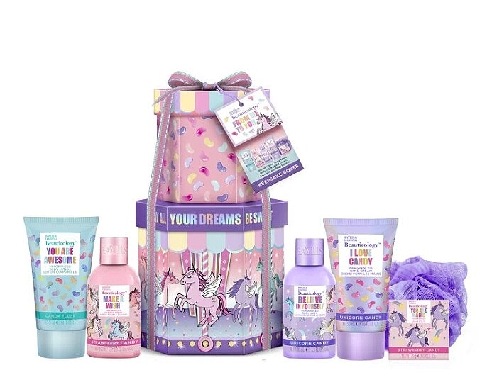 Kolekce Beauticology je hravá, zábavná, kouzelná a barevná. Design s holografickými detaily, pastelovými barvami a magickými motivy tvoří společně s rozmanitými vůněmi cukrovinek perfektní kolekci pro malé či větší milovníky jednorožců, kteří mají chuť na sladké!